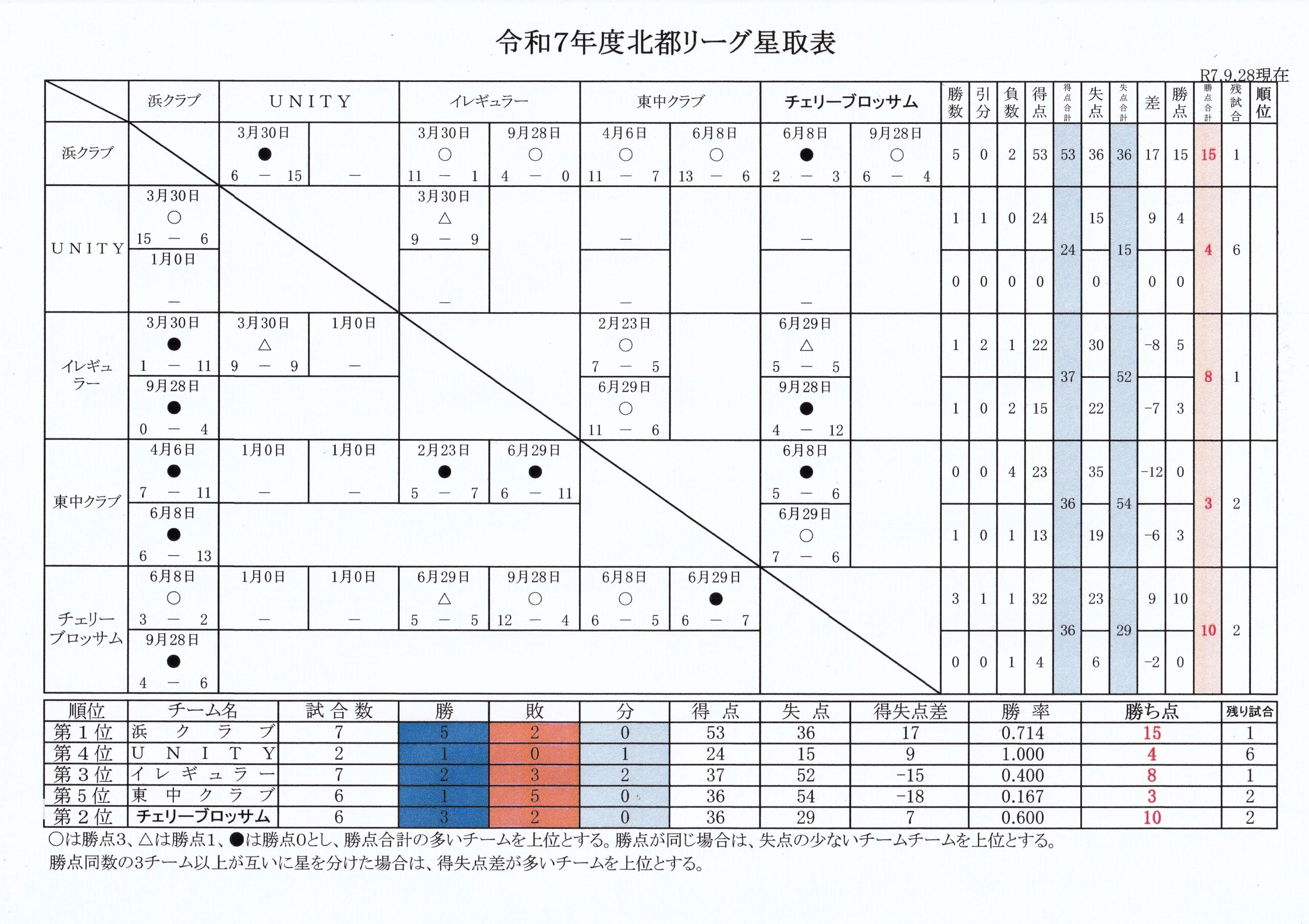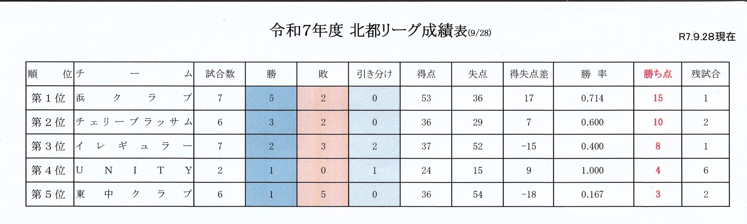 チーム | 勝 | 負 | 分 | 勝ち点 | 残試合 |