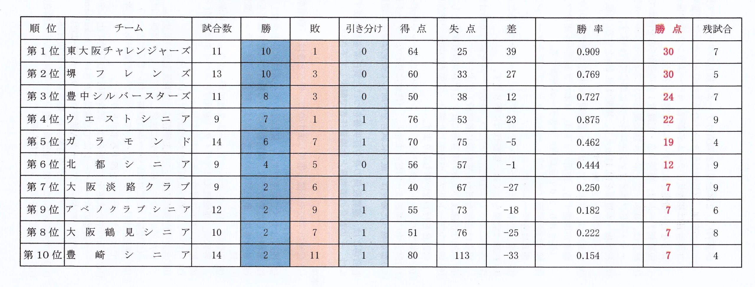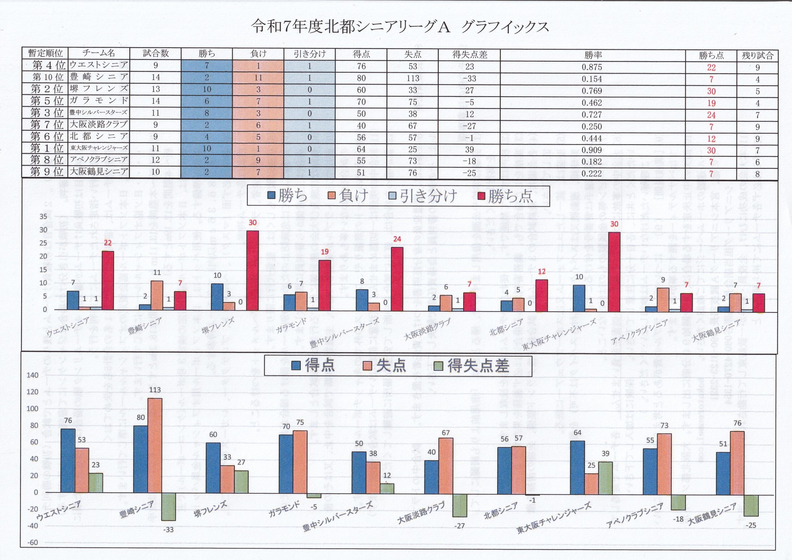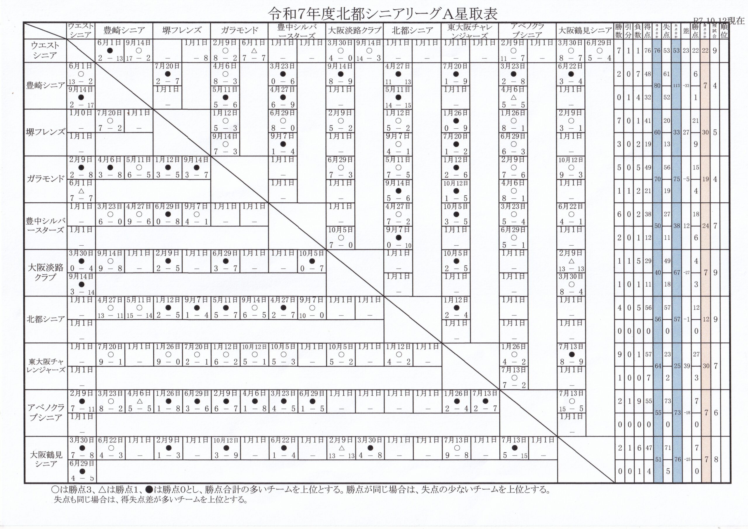 令和7年度 北都シニアリーグA成績表(10/12現在)