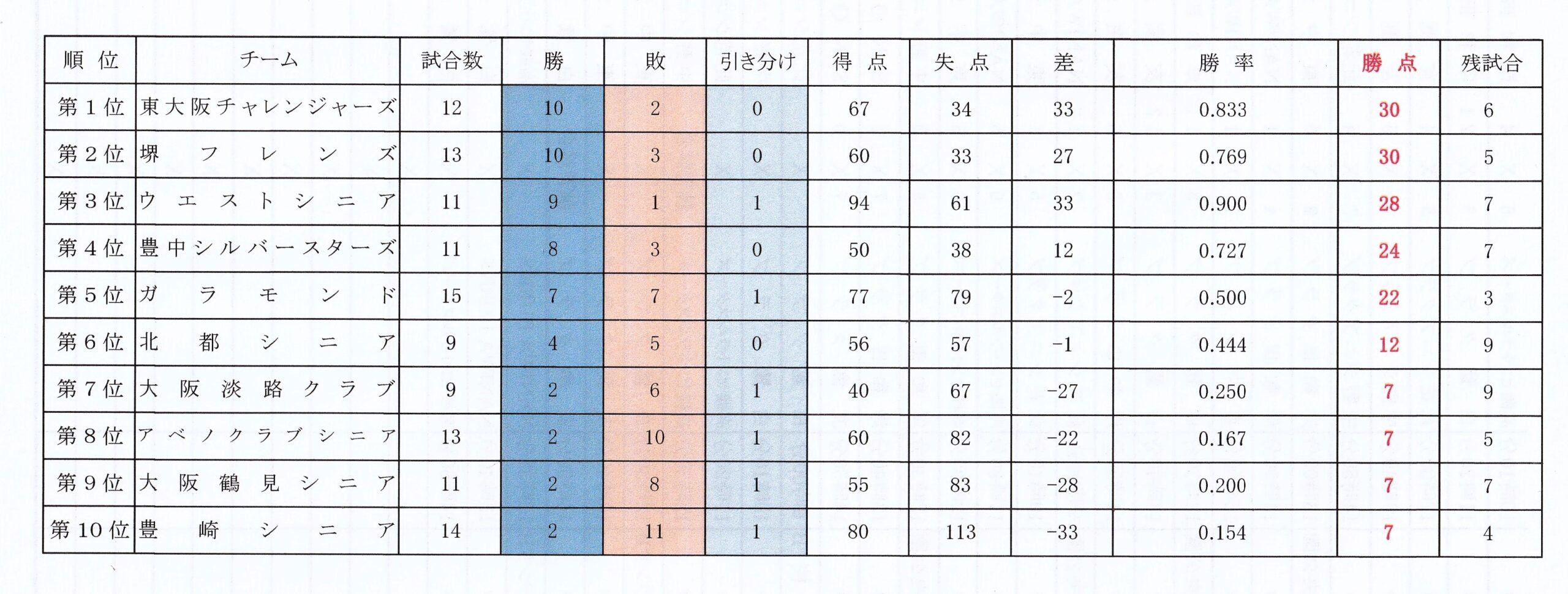 雨が気になる秋空の下、各チームが全力プレーを披露。打線のつながりや守備の粘りなど、シニアならではの熟練したプレーが随所に見られた。特にウエストシニアが攻守にわたって圧倒的な存在感を見せ、連日の勝利でリーグ首位に肉薄し、上位争いに弾みをつけた。