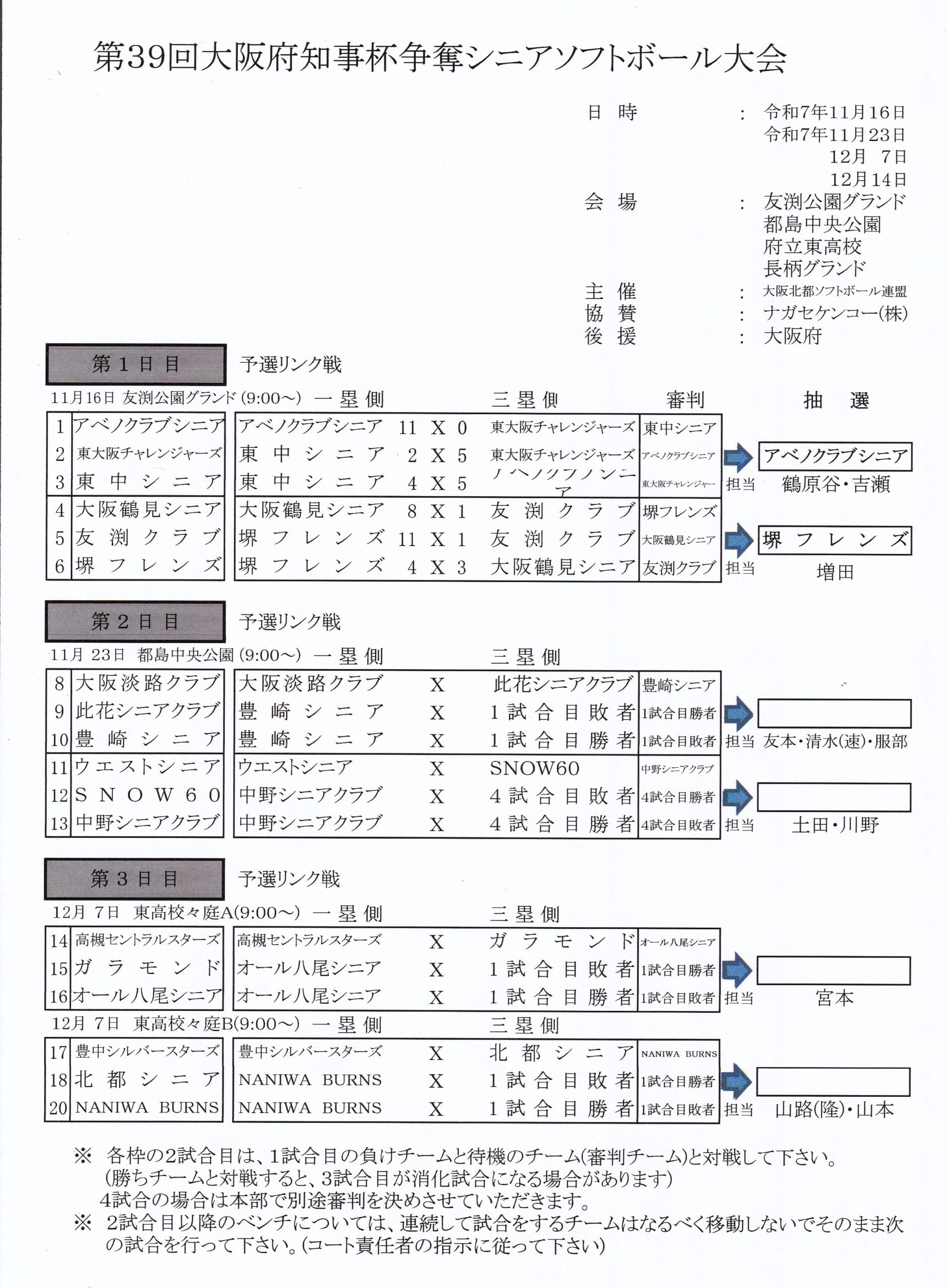 令和7年11月16日、秋晴れの空の下、第39回大阪府知事杯争奪シニアソフトボール大会が開幕しました。初日の6試合が熱戦の末に繰り広げられ、各チームが白熱したプレーを見せました。