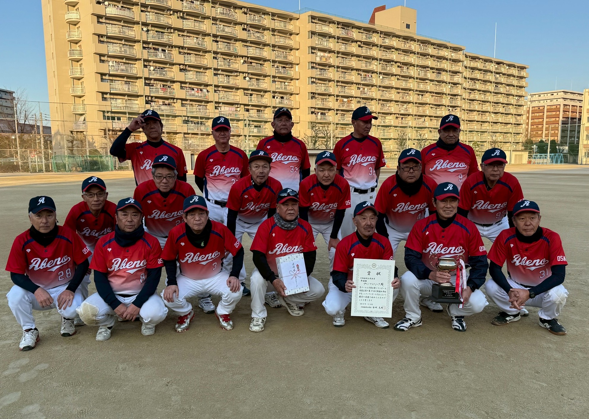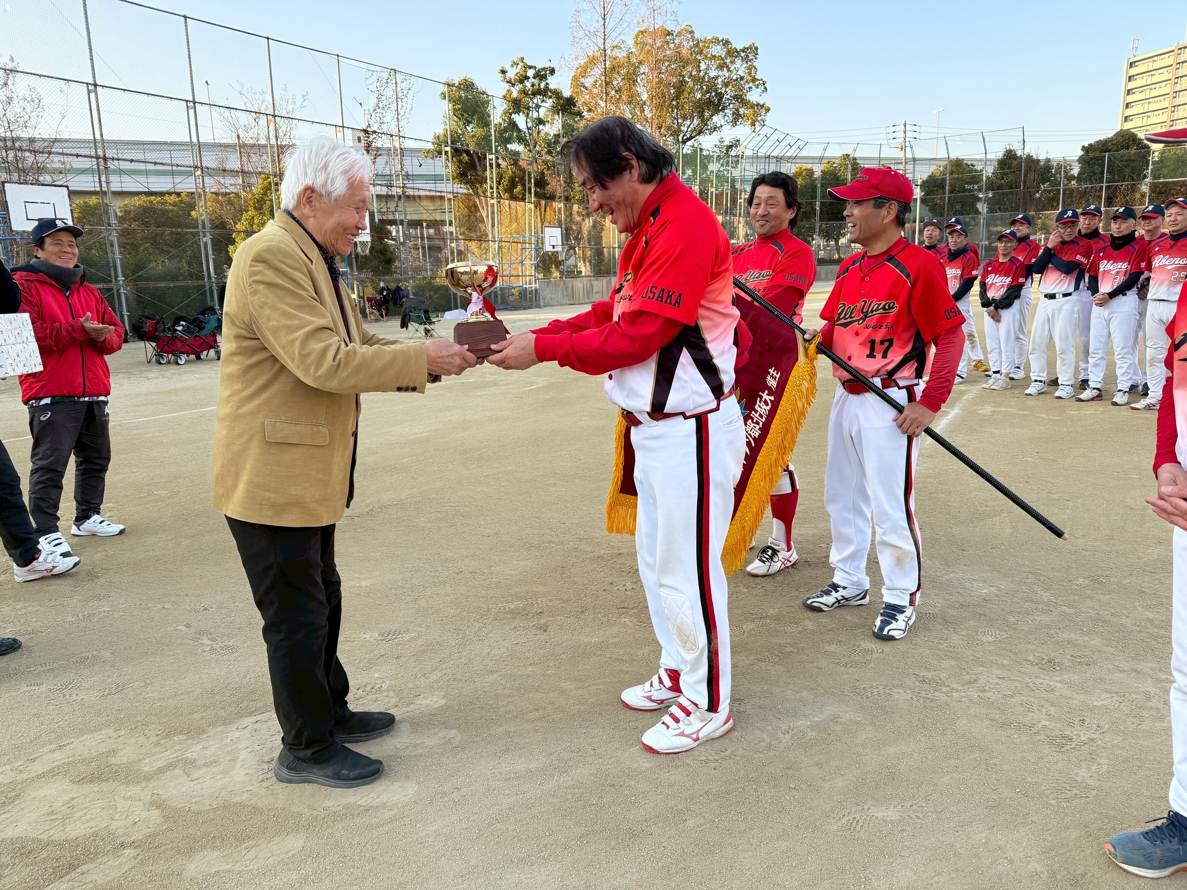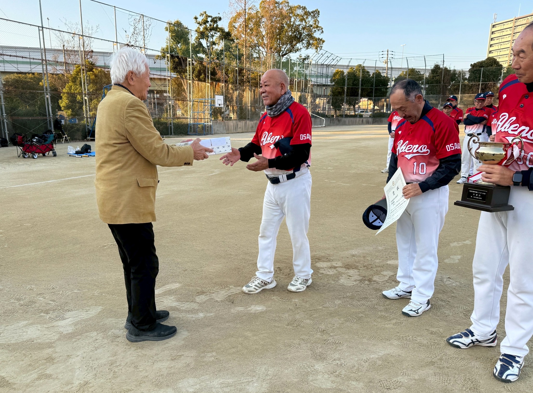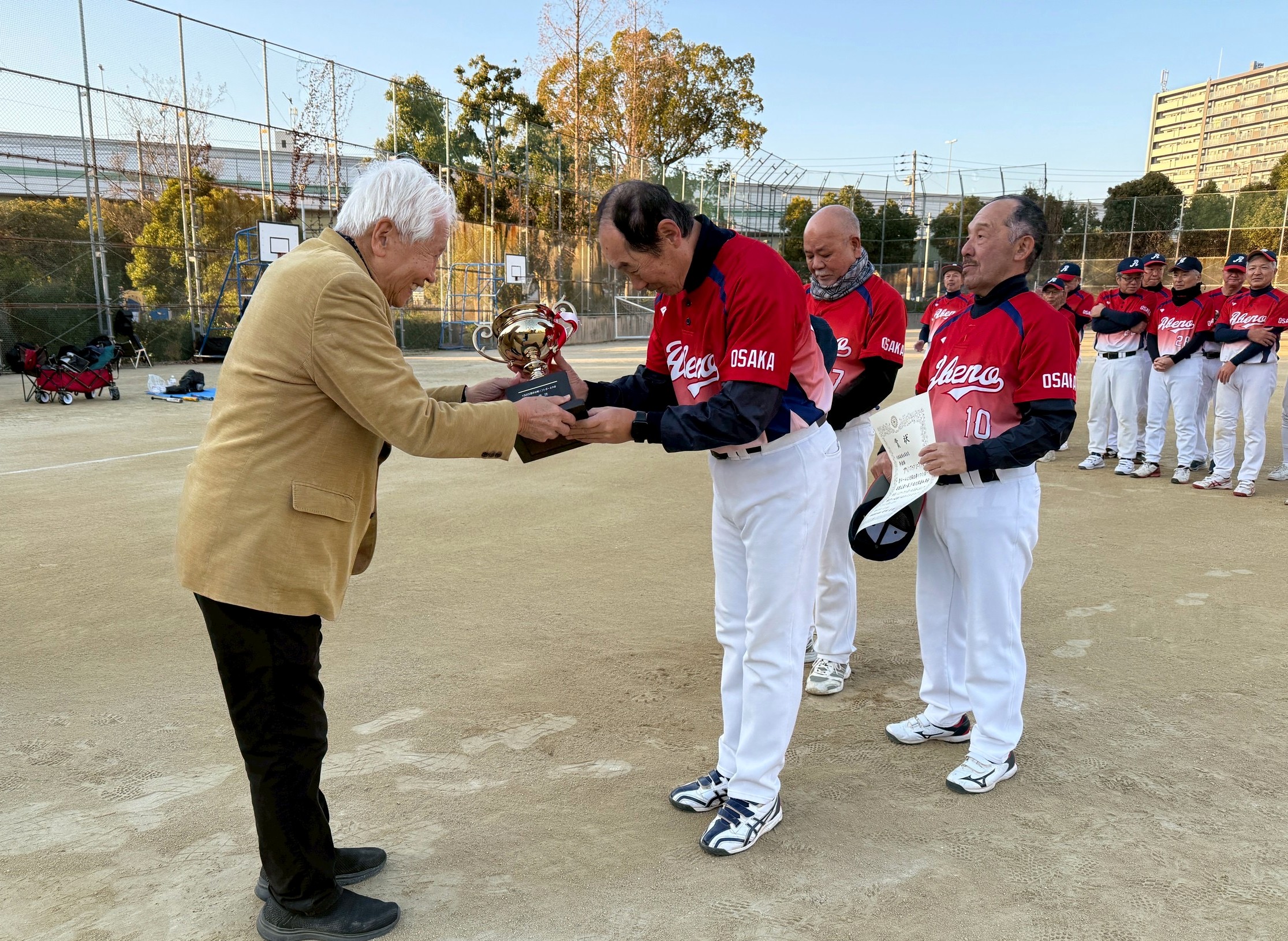 決勝戦はオール八尾シニアが初回から猛攻を仕掛け、アベノクラブシニアを圧倒。9対1の快勝で第39回大会の王者に輝きました。オール八尾シニアは初出場で初優勝。今季より他の4チームと共に北都シニアリーグに参加したが、シニアリーグCからのスタートです。