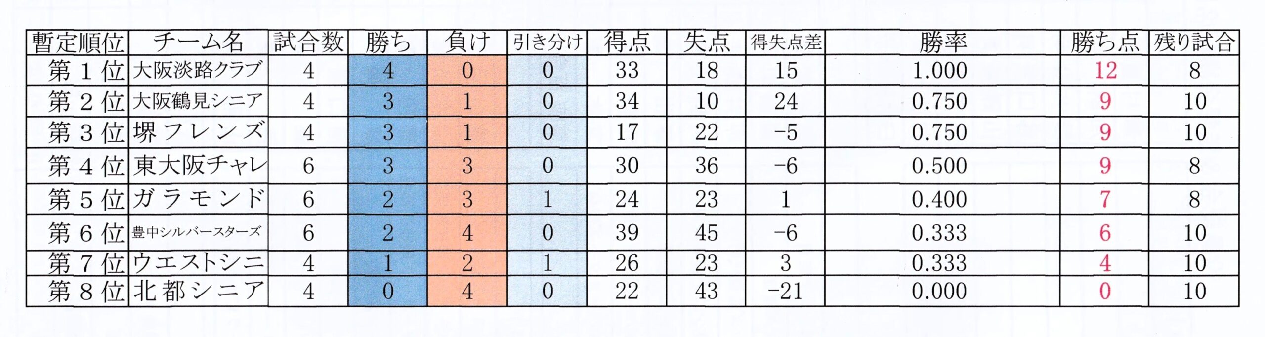 | 大阪淡路クラブ | 3 | 4 | 2 | 0 | 0 | – | – | 9 |