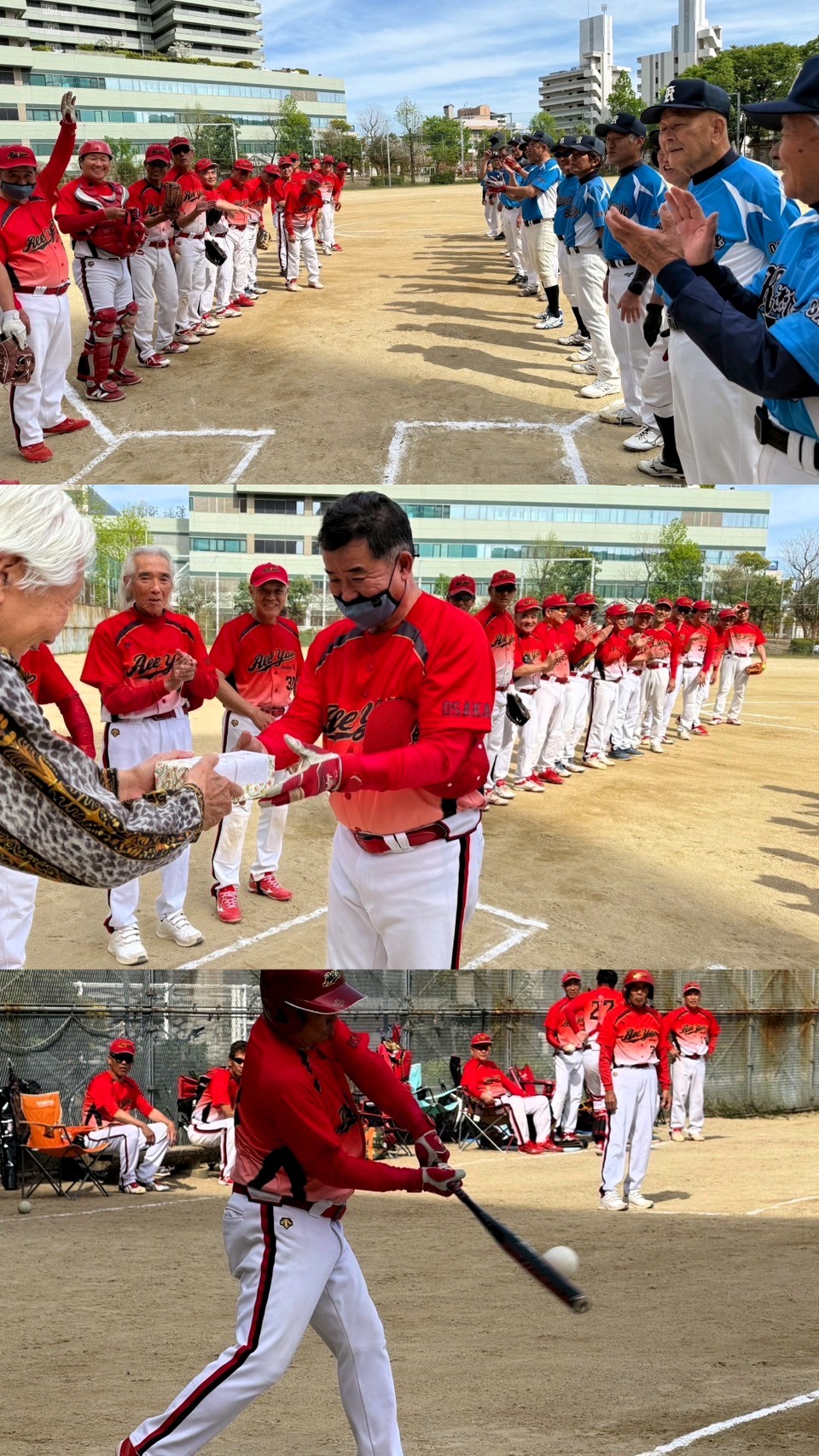 この日は特別な出来事があり、試合開始前にオール八尾シニアの北澤俊明さんのお誕生日祝いが行われました。リーグから記念品が贈られ、相手チーム、自チーム、リーグ役員、そして観客からも温かな拍手が沸き起こり、和やかな雰囲気の中で試合がスタートしました。