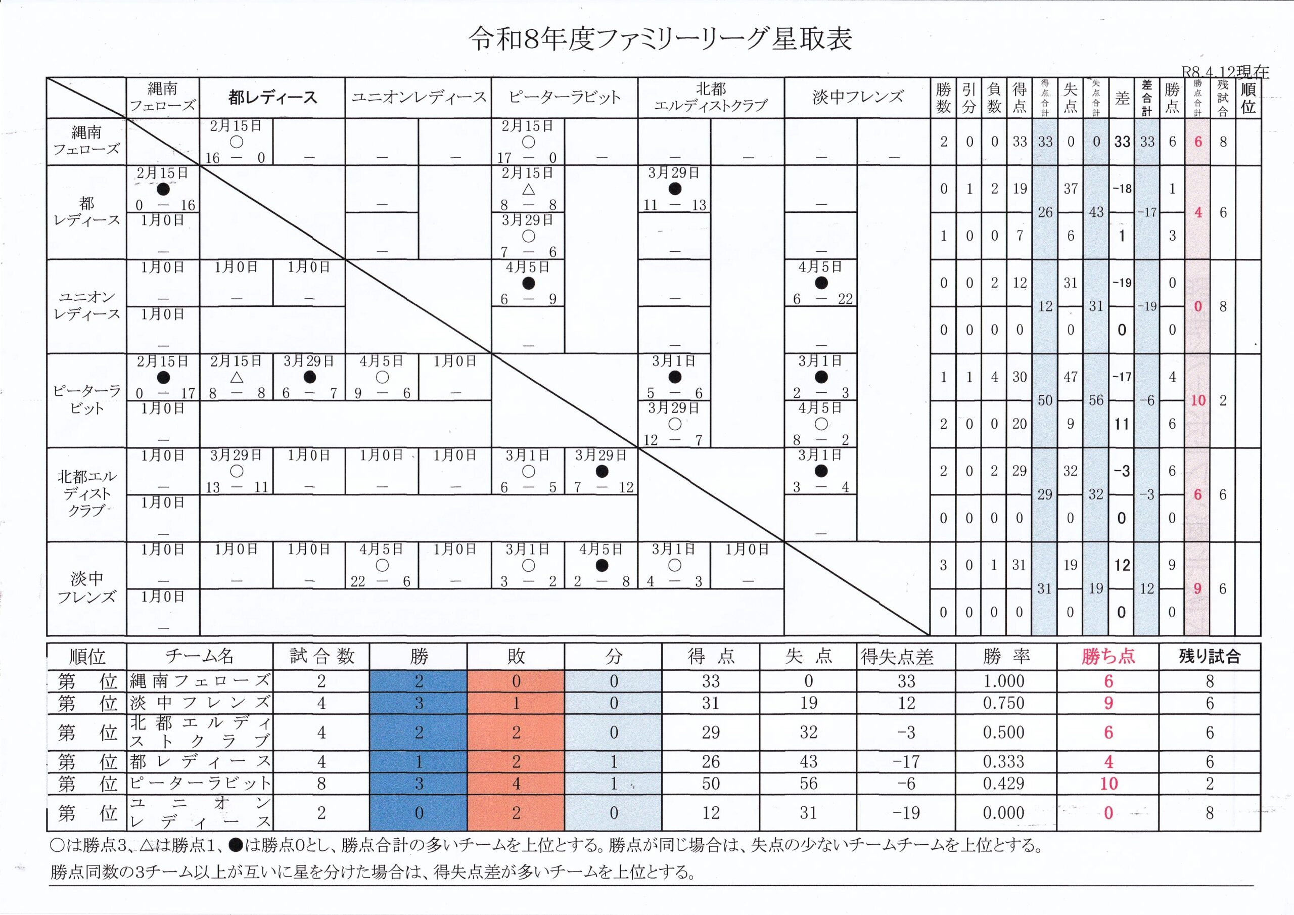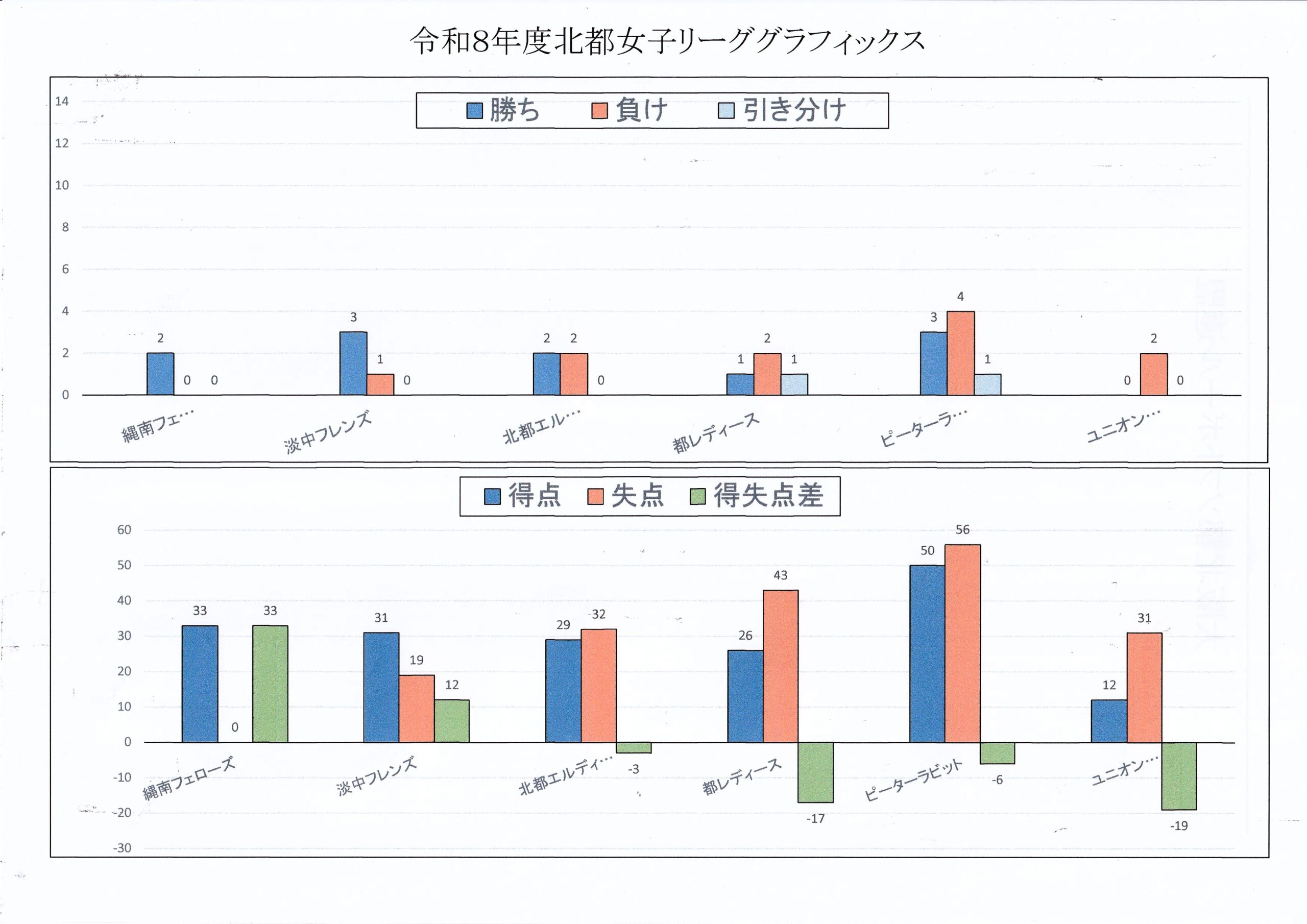 | 第5位 | 都レディース | 4 | 1 | 2 | 1 | 26 | 43 | -17 | 0.333 | 4 | 6 | 2.00 |