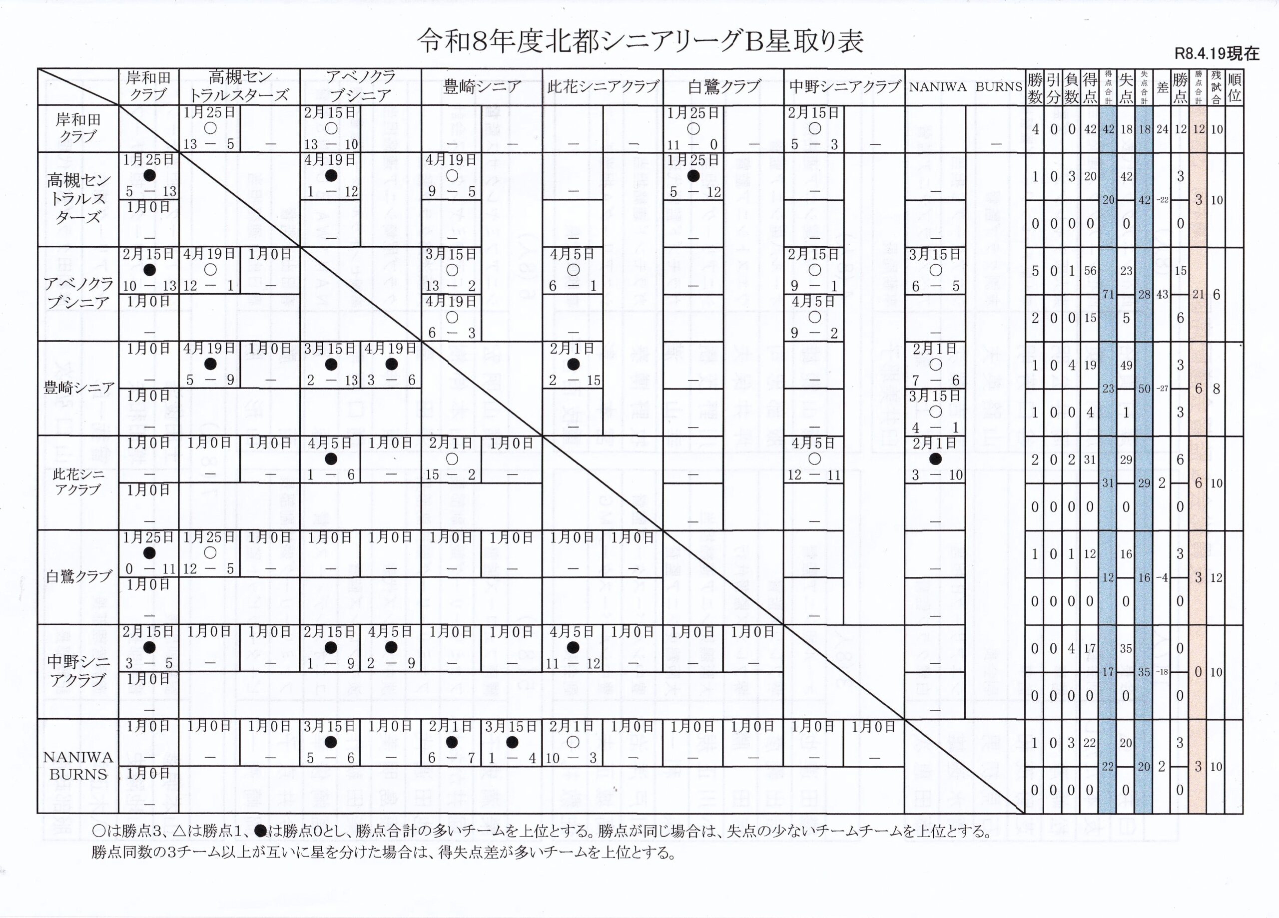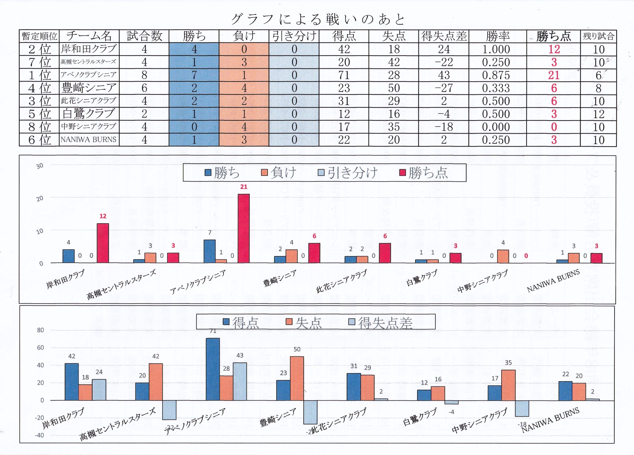 | アベノクラブシニア | 3 | 4 | 5 | 0 | - | - | - | 12 |