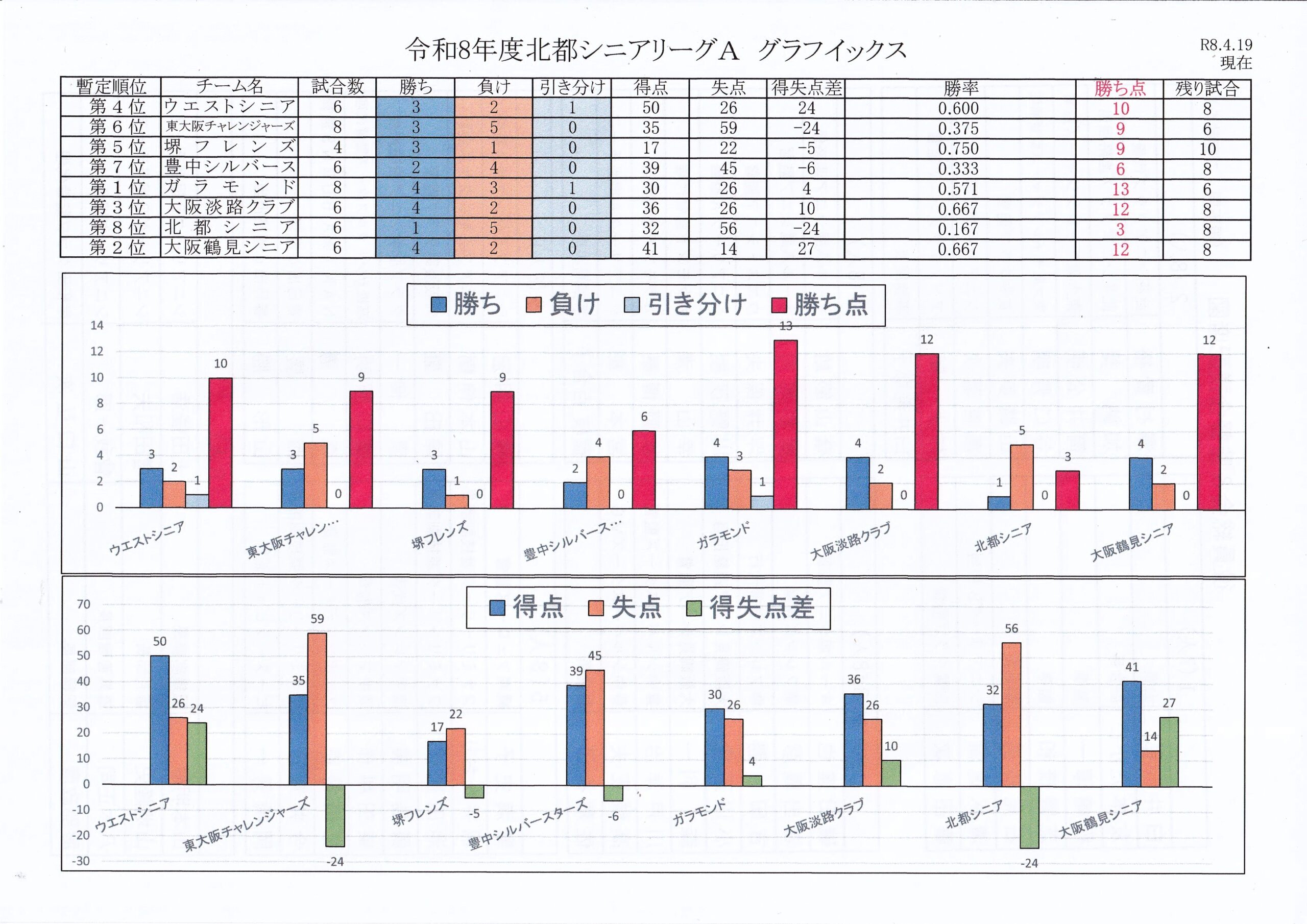 | 第4位 | ウェストシニア | 6 | 3 | 2 | 1 | 50 | 26 | 24 | 0.600 | 10 | 8 | 1.00 |