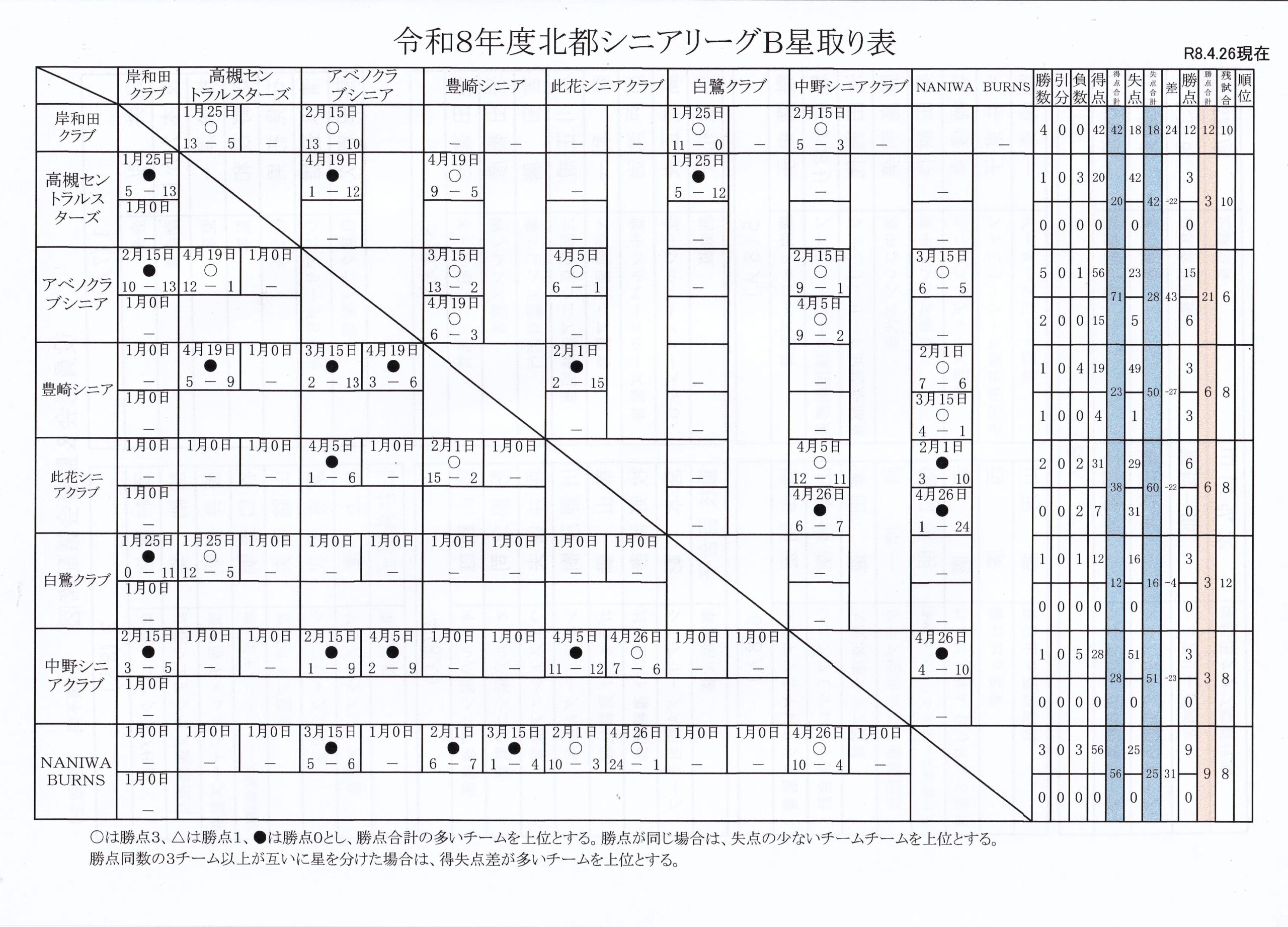 【シニアリーグB 成績表】(ゲーム差=勝ち点差÷3)