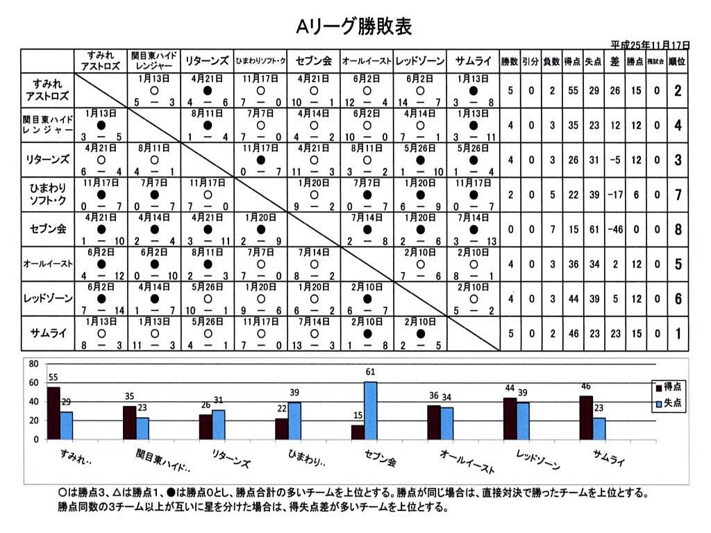 2018年Aリーグの部屋 活動報告・結果 ニュース 平成30年度Aリーグ優勝はバブルス! 投稿: 2018年12月10日 12月9日、東高校グラウンドでAリー […] コメントなし 試合結果 勝敗表 成績表 平成30年度Aリーグ開幕戦フォトライブラリ 30-a-kaimaku-2 Image 1 of 27 所属チーム紹介 関目東ハイドレンジャー サムライ MSフレンズ 過去のリーグ戦績 ah25-result Image 2 of 5