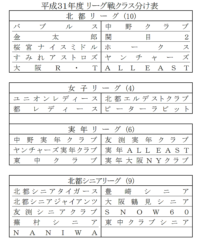 平成31年(2019年)度リーグ戦クラス分け表